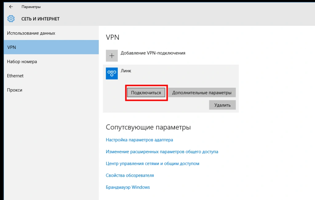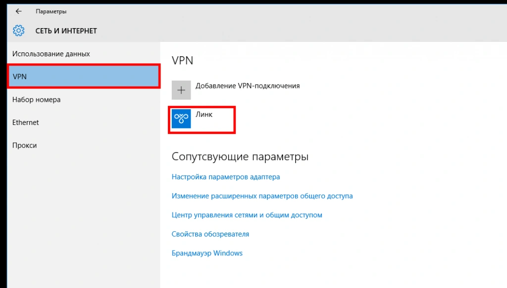 В окне «Сеть и интернет» в левой части экрана нажимаем на раздел «VPN». Находим созданное подключение и нажимаем на него.