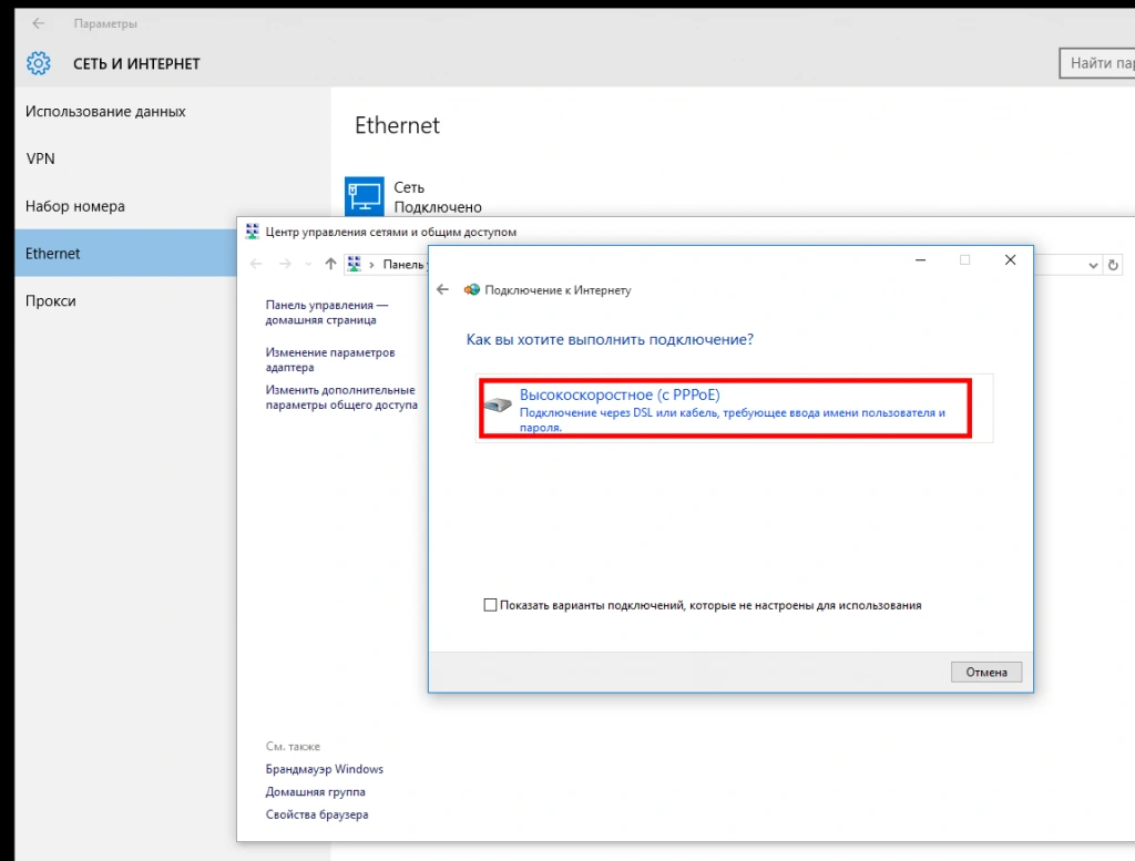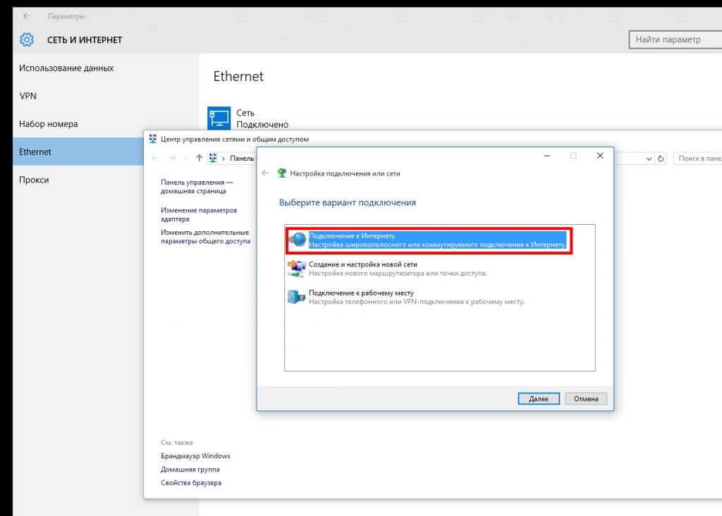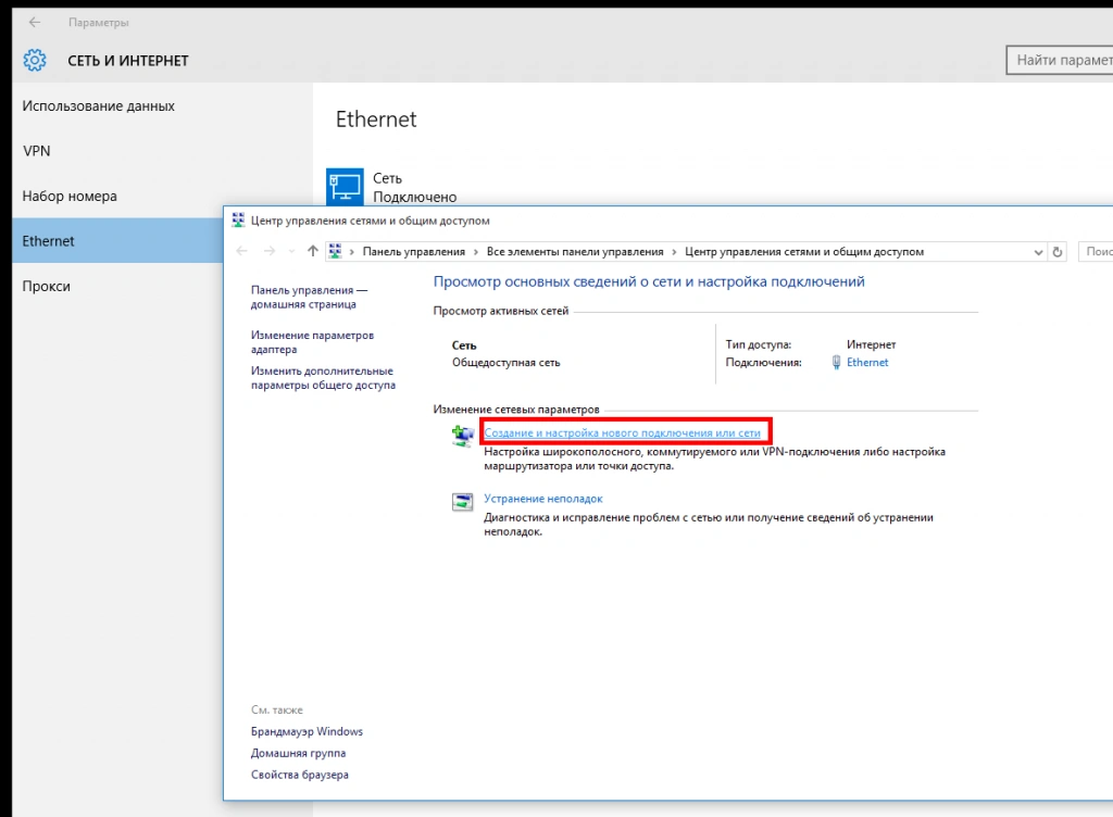В новом окне нажмите на «Создание и настройка нового подключения или сети».