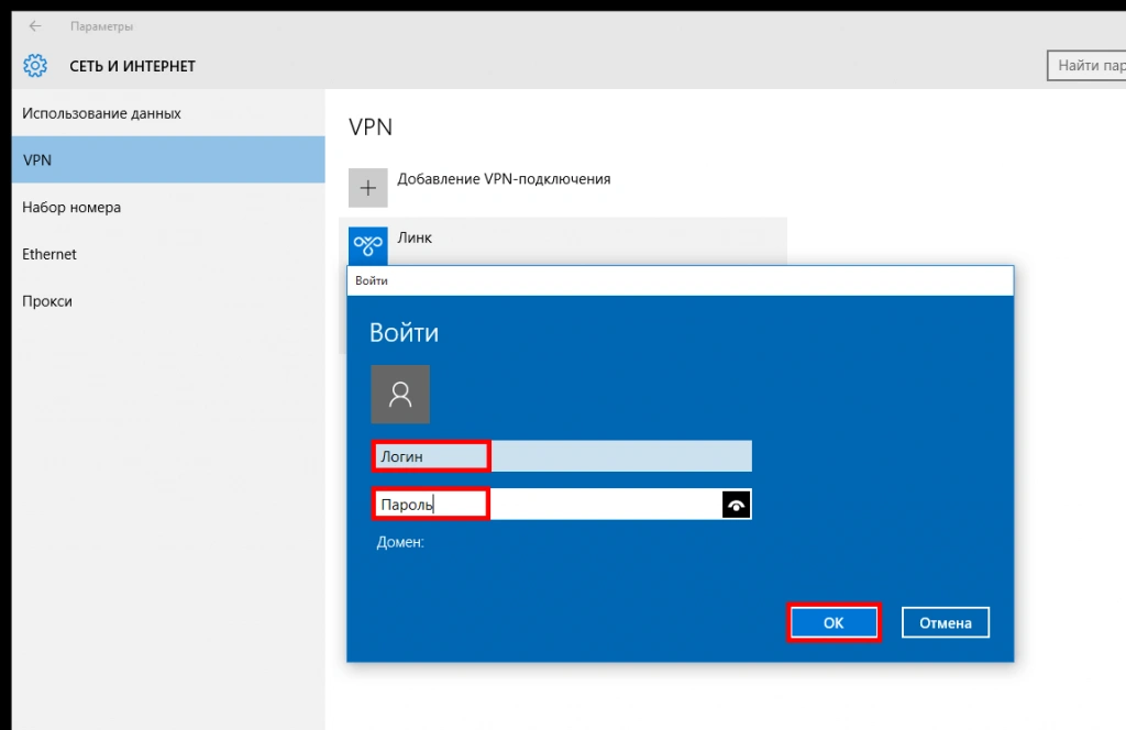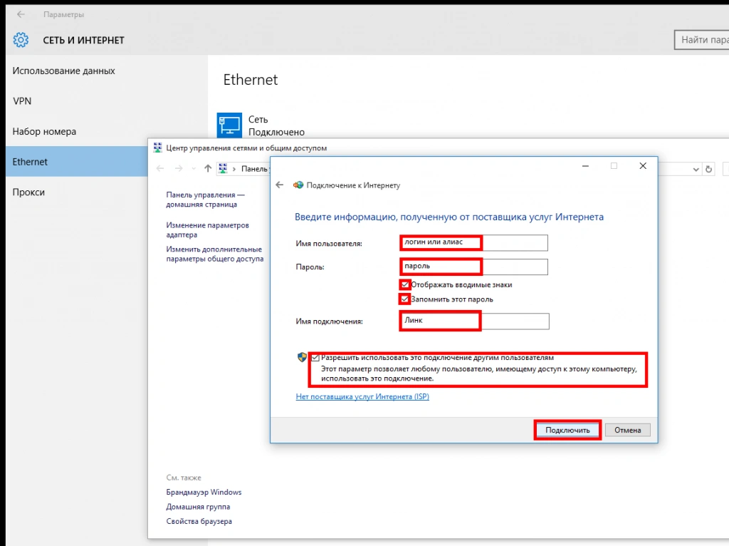 В поле «Имя пользователя» указываем логин из договора, в поле пароль указываем пароль. В поле «Имя подключения» пишем Линк. Ставим галки, как показано на рисунке. Нажимаем кнопку «Подключить».