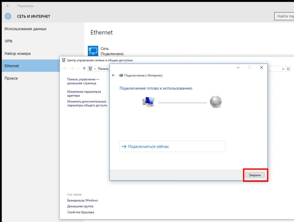 Появится надпись «Подключение готово к использованию». Нажимаем «Закрыть». Закрываем окно «Центр управления сетями и общим доступом».