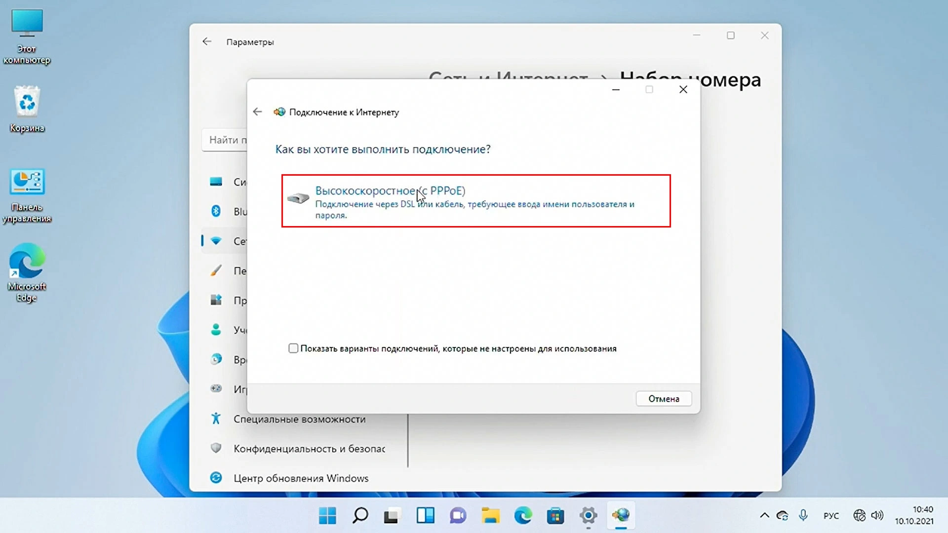 Выберите "Высокоскоростное ( с PPPoE) / Подключение через DSL или кабель, требующее ввода имени пользователя и пароля".