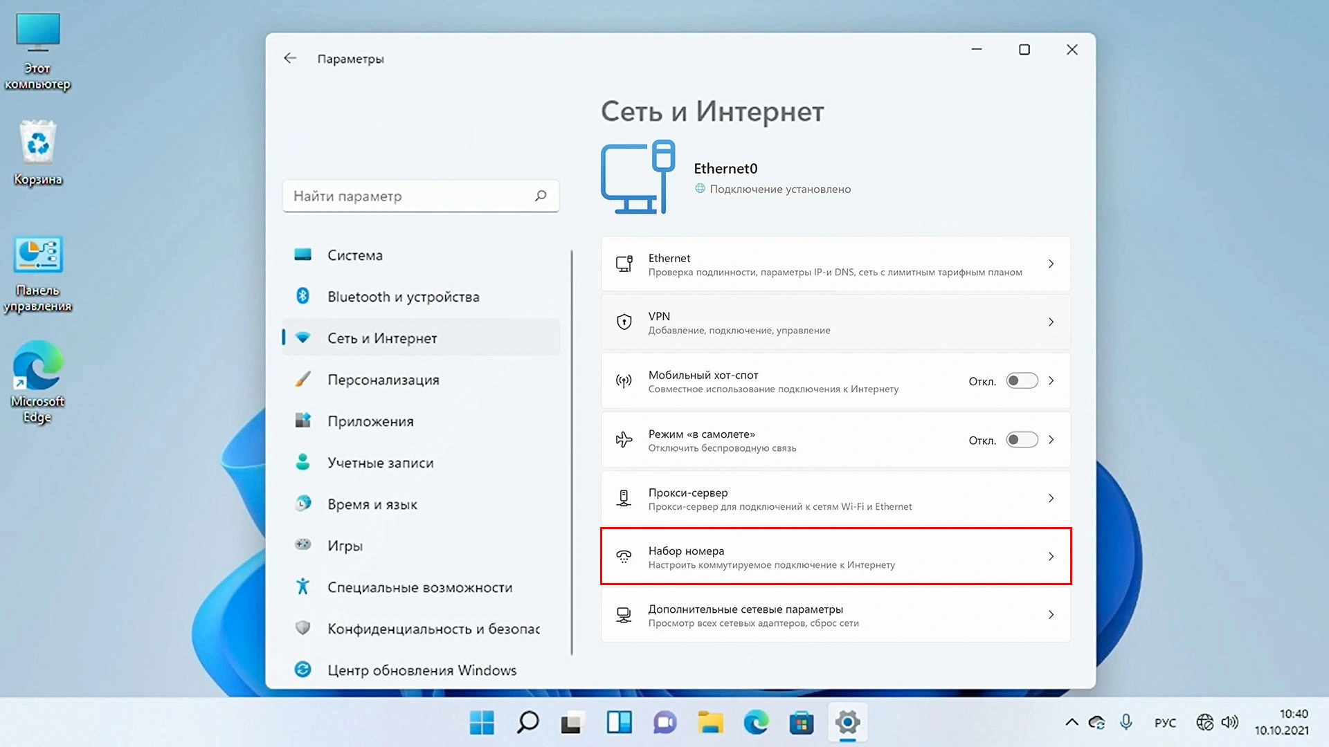 Справа найдите вкладку "Набор номера" и нажмите её.
