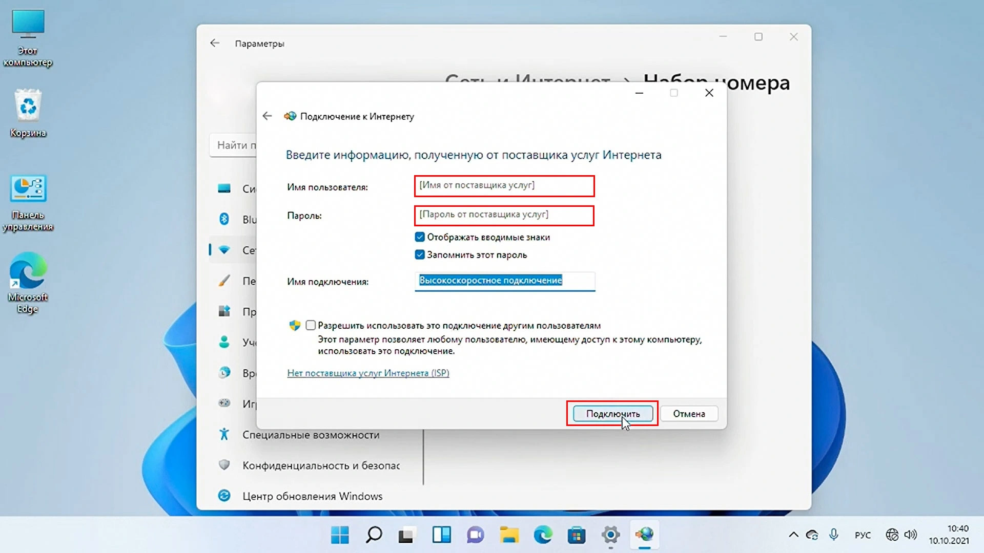 Введите логин, указанный в договоре, в поле "Имя пользователя". Укажите пароль в соответствующем поле. В поле "Имя подключения" введите "Линк". Установите флажки, согласно показанным на рисунке параметрам. Нажмите кнопку "Подключить".