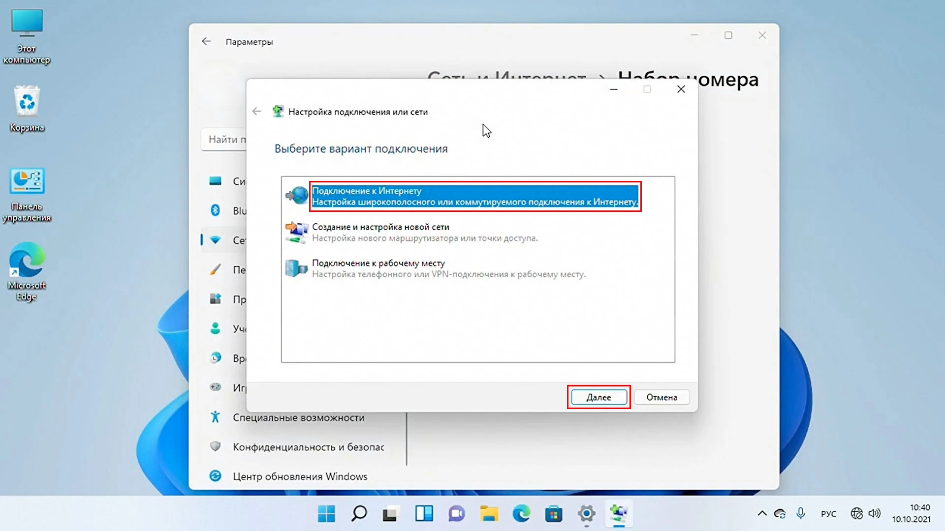 Выделите строку "Подключение к интернету / Настройка широкополосного или коммутируемого подключения к Интернету" и нажмите кнопку "Далее".