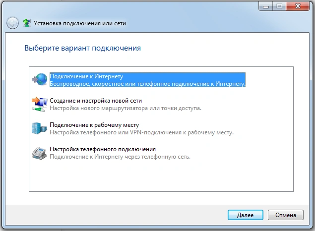 Выбираем «Подключение к Интернету», жмем «Далее».