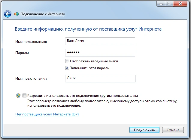 Заполняем графы «Логин» и «Пароль» из ваших сетевых реквизитов, ставим галочку «Запомнить этот пароль».