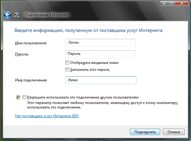 Затем вводим имя пользователя и пароль, указанные в ваших сетевых реквизитах. Имя подключение назовите, например, Линк.