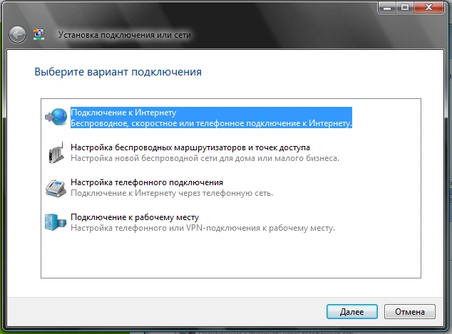 Выберите «Подключение к интернету» и нажмите «Далее».